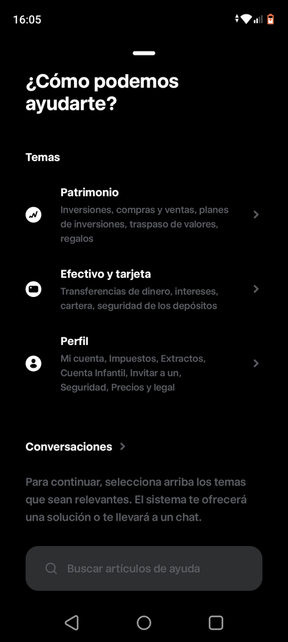 En la pantalla inicial, pulsa en tu círculo arriba a la derecha, luego abajo en ayuda, y ya te sale como la captura que adjunto. Entonces, seleccionas donde encaja tu problema, y de acuerdo, al principio te responde una máquina, pero si tú fuerzas y dices todo el rato que no sé ha resuelto tú problema, al final se te dirige a un humano, el cual a mí me han respondido con cierta rapidez. Lo de la documentación yo cuando hago una operación, al instante tengo la documentación para descargar, sí que es cierto que todo lo relativo a la apertura tendría q buscarlo, pero creo que el problema soy yo que soy un desordenado. Si estuviera en casa lo miraba...