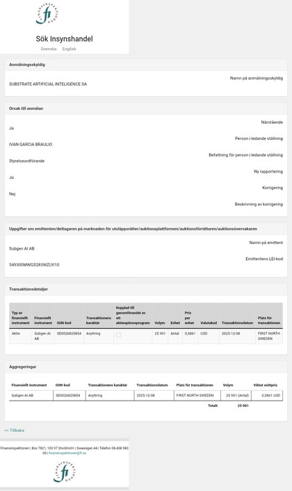 La inversión de Assured Mind S.L. en Subgen AI AB constituye una transacción entre partes relacionadas, lo que genera serias dudas sobre el cumplimiento de las normas de gobernanza corporativa en el mercado sueco, en particular ante la Finansinspektionen y el Nasdaq First North Growth Market.