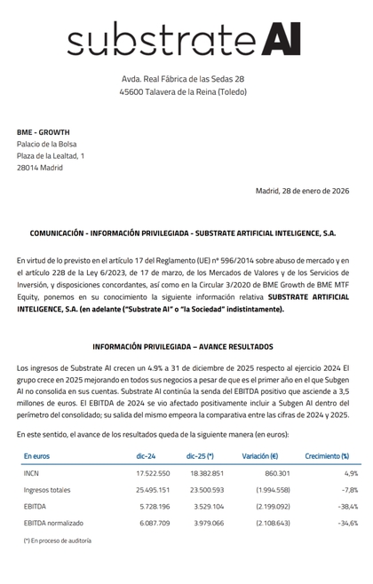 Lo adverti tras los resultados del primer semestre: la ausencia de una cuenta de resultados pro-forma impedía una comparativa fiel entre ejercicios bajo el mismo perímetro de consolidación. Hoy, el avance de resultados de 2025 de Substrate AI confirma la divergencia entre las proyecciones de los informes de análisis externos, tambien lo dije, y la realidad operativa del grupo tras la salida de Subgen AI. Esos informes proyectaban valoraciones basadas en un perímetro que la sociedad ha modificado, resultando hoy en una caída del EBITDA real del 38,4%.