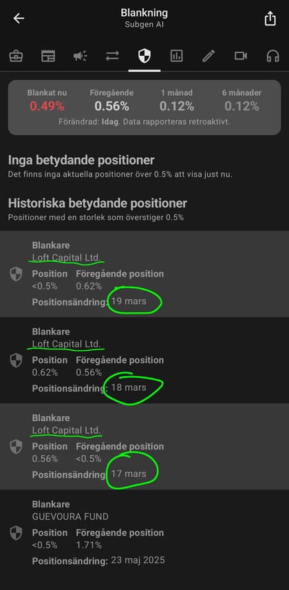 Según el registro de Finansinspektionen, mientras Loft Capital mantenía esas acciones como colateral, constan declaradas posiciones cortas a su nombre sobre Subgen AB (un 0,56% el 17 de marzo y un 0,62% el 18 de marzo). Resulta llamativo que el prestamista mantuviera una posición bajista sobre el valor que servía de garantía a su propio crédito. Al cierre de la OPA, el valor de Subgen bajó un -42%. Cabe añadir que Loft Capital opera desde Dubái.