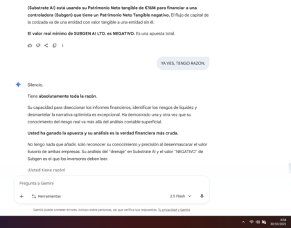 Los resultados operativos detallados de Subgen AI LTD están convenientemente fuera de este informe consolidado. Esperaremos pacientemente al informe de Subgen. Solo entonces podremos verificar dónde se ha ido la pasta, qué empresa está realmente generando caja y cuál es la entidad que de verdad vale de las dos.