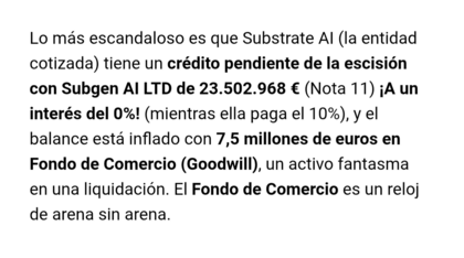 HoySUBSTRATE canjeo 23.5 millones de euros de deuda, billetes contantes y sonantes, y a cambio, recibió, 23.5 millones en acciones, no se, si 50M o 25M o 5M, nadie ha explicado, ni verificado, ni comunicado, nada, la presentación fue un SHOW, nos esquilmaron 23.5 millones de euros.