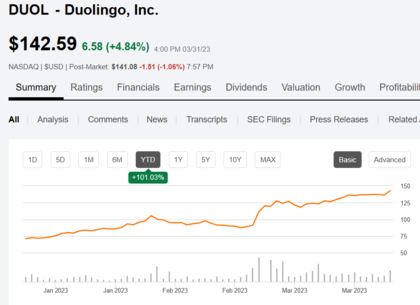 #5 Re: Duolingo (DUOL)... Ver mensaje de ErickSpace369 Top 100 ErickSpace369 Seguir 02/04/23 21:23 Bestial subida que lleva... El Conocimiento es Poder... Responder
