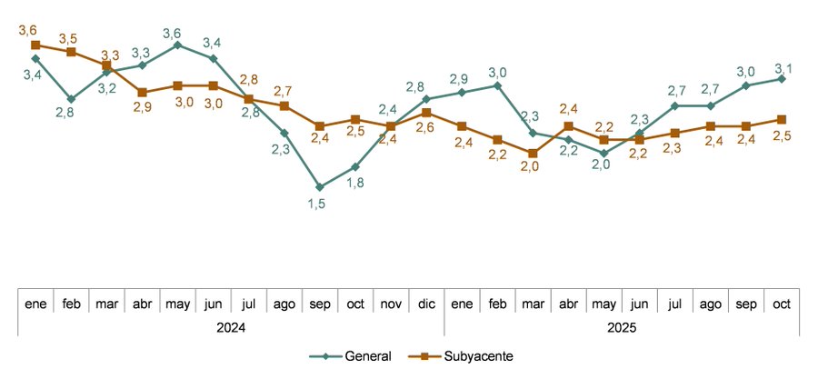El IPC sube una décima en octubre, hasta el 3,1%, y la inflación subyacente escala al 2,5%
