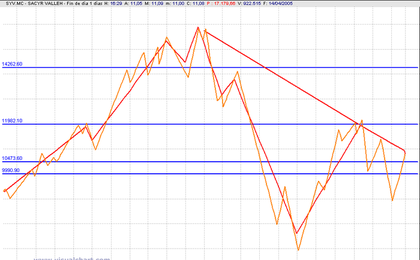 Observando de lejos al mercado, se observa una sucesión ascendente de tendencias descendentes, o dicho de otra forma, cada nuevo descenso alcanza un máximo, primero, y un mínimo, después, que es más alto que los máximos y mínimos de la tendencia previa bajista.