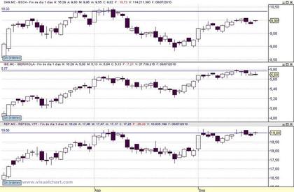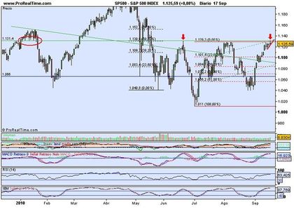 Pongo un gráfico del SP con el cierre de ayer donde se observa que esa zona de los 1.130-1.131 va a ser dura de pelar, observa la parte izquierda del gráfico, verás aque en los 1.131 el precio se detuvo repetidamente durante muchos días, también se detuvo en ese punto el 21 de junio, nuevamente ayer, pero es posible que entanto le quede gasolina al Dow (pues todavía está lejos de los 10.720), el SP supere esa cota y se quede tonteando en esos niveles durante algunos días para finalmente hacer un pull back por debajo de los 1.130, no obstante si pierde la directriz roja de aceleración nos declarará cuales son sus intenciones sin más, aunque me inclino más por la primera opción. En USA el nivel de alcistas aunque es alto todavía necesita extremarse un poco más para que de el vuelco al mercado, hay que tener paciencia y no precipitarse, un saludo.