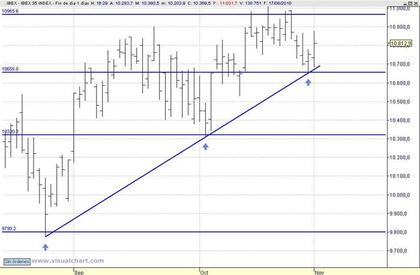 Bueno si trazas una linea apoyandola en los maximos y por la parte de abajo en los minimos sucesivos se obtiene un Triangulo con apoyos en la linea del triangulo en los 10300 , martillo en los 10500 y finalmente en los 9776 de la linea del Triangulo me imagino que a eso se refiere Antonio
