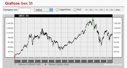 En el Ibex el máximo del año 2007 es mayor que el máximo del 2008, y éste mayor que el máximo del 2009, y éste mayor que el máximo del 2010. ¿Qué conclusión sacas? La tendencia primaria es bajista. El análisis no tiene vuelta de hoja. Si en la bolsa USA ajustas para el valor del dolar el resultado es el mismo.
