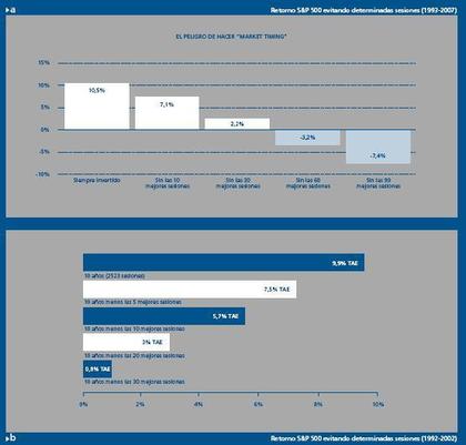 A pesar de que el rendimiento a largo plazo de cualquier mercado de valores se aproxima a un constante 10%, los rendimientos de la bolsa a corto plazo son asimétricos. Una tendencia muy común de los inversores es abandonar su plan de inversión saliendo del mercado con la esperanza de volver a entrar cuando el entorno sea más favorable, lo que supone un error a tenor de los siguientes gráficos