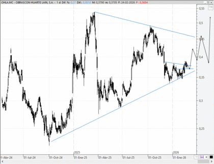 En cuanto a OHLA, grupo constructor e industrial con un perfil claramente más especulativo, la operativa fue muy similar. Propuse compras agresivas buscando la superación de la resistencia en 0,37 euros. Esa ruptura se produjo, el título ha confirmado por encima de 0,38 y, de momento, el antiguo techo está actuando como apoyo.