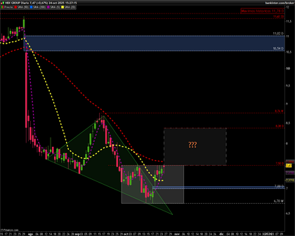 Lo de esta sesión ha sido de traca. Después de alcanzar un máxímo del día en los 7,50€, lo que hacía presagiar otro día glorioso con un buen cierre, se ha iniciado una bajada en picado marcando un mínimo en los 7,18€, para al final de la sesión arreglarse un poco el desaguisado y tener este cierre en los 7,37€ que ha sabido a poco. Ha sido por eso un buen cierre y se va en la línea de recuperación marcando máximo tras máximo desde la caída en barrena que llevó a HBX directamente al guano.