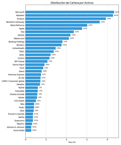 Empresa Ticker Valor (€) % Cartera ----------------------------------------------------------------- Alphabet Inc. GOOGL 11.970,88 10,54% Microsoft Corporation MSFT 7.810,16 6,88% Amazon.com, Inc. AMZN 5.376,69 4,73% Meta Platforms, Inc. META 5.132,23 4,52% Booking Holdings Inc. BKNG 4.838,82 4,26% Berkshire Hathaway Inc. BRK-B 4.192,78 3,69% UnitedHealth Group UNH 4.116,11 3,62% Taiwan Semiconductor Mfg. TSM 3.530,42 3,11% JPMorgan Chase & Co. JPM 3.510,31 3,09% Bank of America Corp. BAC-PQ 3.346,64 2,95% Visa Inc. V 3.245,94 2,86% Moody's Corporation MCO 3.092,72 2,72% Mastercard Inc. MA 3.051,05 2,69% NVIDIA Corporation NVDA 3.009,79 2,65% Citigroup Inc. C 2.877,77 2,53% The Walt Disney Company DIS 2.711,29 2,39% Airbnb, Inc. ABNB 2.680,33 2,36% CVS Health Corporation CVS 2.491,25 2,19% PayPal Holdings, Inc. PYPL 2.453,27 2,16% General Motors Co. GM 2.435,38 2,14% Fair Isaac Corporation FICO 2.306,44 2,03% Walmart Inc. WMT 2.288,08 2,01% Occidental Petroleum Corp. OXY 2.278,97 2,01% O'Reilly Automotive, Inc. ORLY 2.052,29 1,81% The Charles Schwab Corp. SCHW 2.048,64 1,80% Parker-Hannifin Corp. PH 1.912,36 1,68% S&P Global Inc. SPGI 1.911,68 1,68% GE Aerospace GE 1.828,80 1,61% The Home Depot, Inc. HD 1.723,42 1,52% Thermo Fisher Scientific TMO 1.698,15 1,50% Starbucks Corporation SBUX 1.689,55 1,49% Danaher Corporation DHR 1.632,39 1,44% Fiserv, Inc. FI 1.561,08 1,37% Caterpillar Inc. CAT 1.443,43 1,27% Medtronic plc MDT 1.439,66 1,27% Waste Management, Inc. WM 1.381,53 1,22% Canadian National Railway CNI 1.287,79 1,13% Eli Lilly & Co. LLY 1.210,51 1,07%