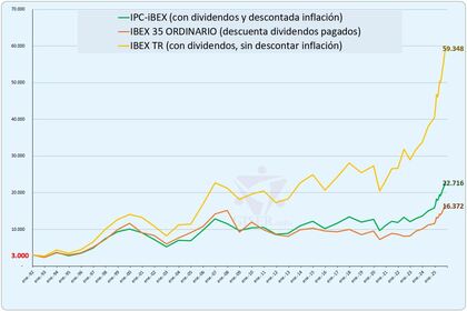 Somos conscientes de que probablemente el nuevo hilo pase indefinidamente tan desapercibido como este, pero aún así consideramos que, aunque sea testimonialmente, es necesario que exista, en algún sitio, una referencia realista del mercado español que incorpore dividendos y descuente inflación, para conocer la situación real de nuestra bolsa de valores.