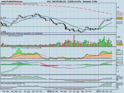 Tras haber permanecido en una fase 1 (resistencia en 5,34€ y soporte en 3,48€) desde Mayo del 2010, Sacyr consiguió fugarse en 5,34€ a mediados de Enero de este año acompañada de un fuerte volumen que le permitió ascender e, incluso, atravesar la resistencia de los 6,85€ con gran impulso. Desde el momento de la fuga, las manos fuertes aparecieron y se mantuvieron. También, la MM30 es alcista y, tanto la FR como el RSC Mansfield son positivos. A esto se le une unos niveles de acumulación/distribución que dan consolidación al valor.