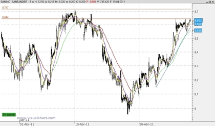 cuando acaben los arbitrajes posteriores a los dividendos, se normalizara, y dependera del contexto de mercado, de momento en intradia es alcista, tu has vendido en resistencia, me parece bien, pero cero que olvidaste el contexto de mercado, alcista a corto plazo, y con unas graficas intradiarias que no han dado señal de debilidad en ningun momento. ahora te cuelgo el cahrt intra de san