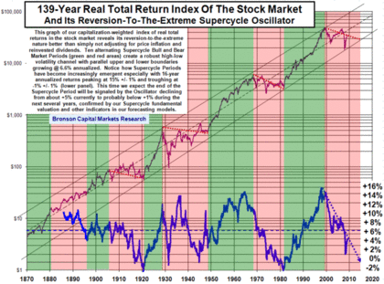 Esa gráfica está ajustada para inflación, lo que supone que los valores de la izquierda no son valores nominales del DJIA. Bronson tiene una gráfica similar aunque un poco mejor, en la que pone el retorno total de la bolsa, incluidos dividendos reinvertidos, ajustado por inflación. En ella se ve muy bien la alternancia de periodos buenos y malos.