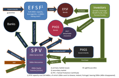 Mientras los mercados de acciones lo recibían con alegría y los ciudadanos por fin respiraban tranquilos, los expertos eran más escépticos hasta que se conocieran sus detalles. Es un acuerdo complejo en el cual el EFSF (European Financial Stability Facility) emite bonos y con el dinero recibido crea un SPV (Special Purpose Vehicle) que recibe también dinero del IMF, de otros gobiernos y de fondos soberanos y que es el que se encarga de recapitalizar bancos y comprar bonos de PIIGS en el mercado primario y en los secundarios, todo ello apalancándose varias veces.
