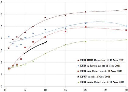 Y por si fuera poco hay un tercer problema, las emisiones del EFSF, que se supone que tienen categoría AAA y nominalmente la tienen, cotizan sin embargo como si fueran AA o como mucho AA+. Puede que las agencias se lo estén pensando antes de quitarle a Francia la triple A, pero los mercados sin embargo lo tienen muy claro. Ya no la tiene a efectos prácticos.