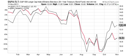 Mientras las bolsas celebran la marcha de Berlusconi, los mercados de crédito continúan mostrando una separación cada vez mayor con los mercados de acciones. Estas divergencias suelen ser resueltas a favor de los mercados de crédito en 8 de cada 10 ocasiones mediante movimientos proporcionalmente mayores de los mercados de acciones en la dirección de la divergencia. En la actual coyuntura yo tengo pocas dudas de que los mercados de crédito llevan razón y que los mercados de acciones en algún momento próximo van a caer con fuerza cerrando la divergencia a la baja.