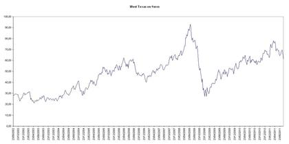 Esta semana he llenado el tanque al precio más caro de mi vida. Echando una ojeada al gráfico del West Texas en €uros he comprobado que el precio del barril es un 23% más barato que en abril.