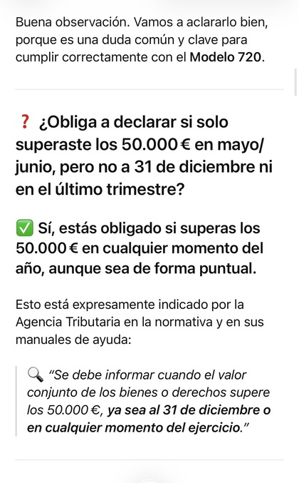 “Para cuentas vigentes el 31dic desde el 1ene-30sep puedes tener el saldo que quieras en el extranjero sin límite que afecte al 720.“