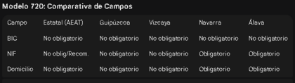 Sobre el 'NIF en el país de residencia fiscal' es obligatorio en Navarra y Álava. (además estas dos últimas indican como obligatorio todos los campos dirección y fecha de apertura para cualquier tipo de valor)