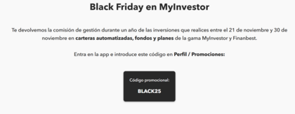MyInvestor, neobanco digital respaldado por Grupo Andbank, El Corte Inglés, AXA y varios family office, celebra el Black Friday, eliminando las comisiones de gestión de todos los productos de inversión de la gama MyInvestor y Finanbest durante 2025.