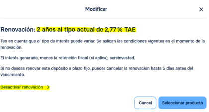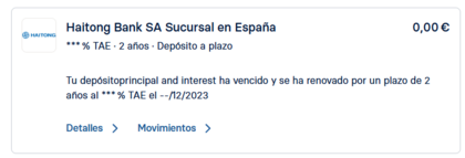 De hecho, acabo de descubrir un error (además de la parte en inglés), la frase que pone es: Tu depósito principal and interest ha vencido y se ha renovado por un plazo de 2 años al 2.77% TAE. Eso no es cierto porque ese depósito se renovó por encima del 4%. Están poniendo el tipo actual.