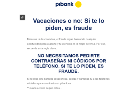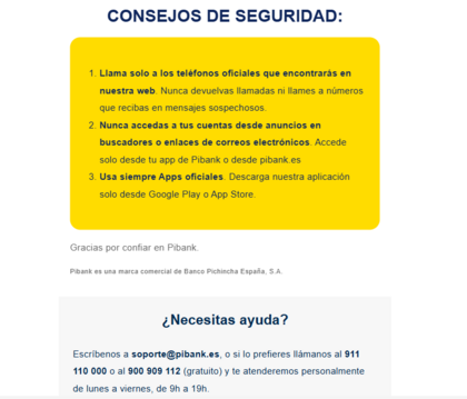 Lo primero mira el remite, luego si hay algún enlace en un email, pones el cursor encima sin darle y verás normalmente abajo a la izquierda del navegador, la URL (dirección web) a donde te lleva. Ahí has de ver si es Pibank.es el dominio final