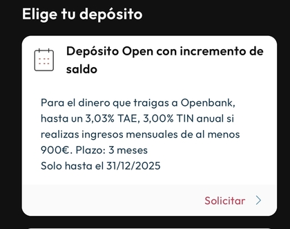 Yo tengo el vencimiento del 4% EBN a finales de enero y lo que voy a hacer es realizar la contratación en diferido. Antes del 31/12 contrataré el depósito por el importe exacto que ingresaré y como hay 45 días para ingresarlo, en cuanto me venza el depósito de EBN transferiré el dinero a Open y al día siguiente de la llegada se constituirá la imposición.