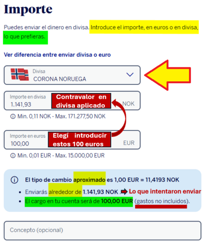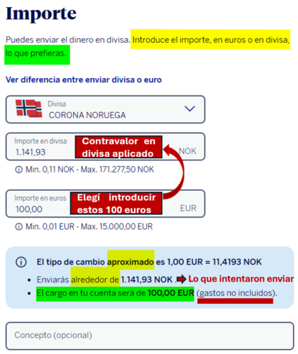 Metí euros, 100 € como importe que sería el que adeudarían en mi cuenta, juntos con los "gastos no incluidos" que no sé si vendrían en otro movimiento distinto o en el mismo adeudo de los 100€ (convertido a coronas noruegas) engrosado por esos gastos que aquí con concretan. Ahí dicen también que el beneficiario recibirá en su cuenta noruega la cantidad de 1.141,93 NOK.
