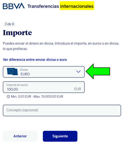 Pero incluso, como apuntas, incluso habiendo entrado por "transf. internacional", se podría haber elegido en el desplegable, que contiene hasta 33 divisas y el EURO es una de ellas, de modo que así quedaría el paso 3 de 6:
