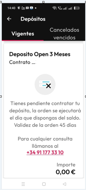 A ver Sparrow,la imagen que te he puesto es la última pantalla justo cuando acabas la contratación de cada depo y es la última pantalla que te sale.Luego ya no te vuelve a salir por ningún sitio en la app. Lo único que te sale después en la app es esa imagen que has puesto de los depos que hayas contratado,si has contratado 7 pues tendrás 7 depos acabados en diferentes numeraciones. Yo también tengo esa imagen tuya de cada depósito contratado. No se si me explico