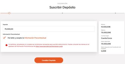 Hago la llamada de rigor haciéndome el ignorante por no saber a que se debe el error y el gestor que me atiende amablemente me dice que me lo habilita... Acto seguido vuelvo a intentar contratar depósito y... Voilà... depósito constituido...
