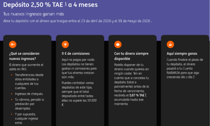 Ingresos: se considerará el importe correspondiente a los ingresos por nómina, pensión, prestación por desempleo, transferencias recibidas desde otra entidad, ingreso de cheques, así como el importe y los intereses liquidados de los depósitos promocionales de ING que hubiesen sido cancelados por el cliente durante el periodo de comercialización (entre el 23 de abril de 2026 y el 31 de mayo de 2026 ) y hasta la fecha de contratación del Depósito.