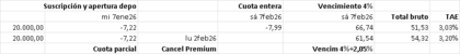 Comparando un depo premium 20k 1 mes abriendo el 7ene26 y pagando la 1ª cuota parcial de 7,22€. El 3feb26 se paga la 2ª cuota entera. Resulta en TAE 3,03%.