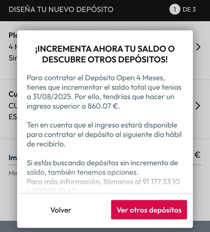 Acabo de meter un importe fuerte esta mañana para abrir el depósito del 2,78% para incrementos de posición y para mi sorpresa me dice que no alcanzo a incremento de saldo. Soy consciente de que tenia unos 900 € menos que en esa fecha, peor por ese motivo he ingresado hoy lo que queria meter en el depósito, más unos 2000 € para asegurar el incremento de posición.