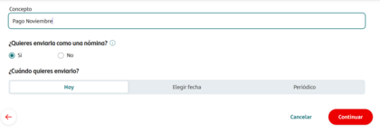Dekana, es "Santa" debes elegir la opción "nómina" y con eso basta. En "Concepto" no es necesario poner nada, puede quedar en blanco. Pongo una imagen de hoy mismo. Lo de "Pago Noviembre" en "Concepto" es como lo hago yo, pero no es necesario.