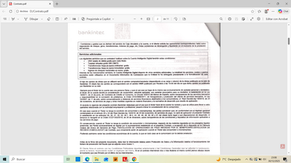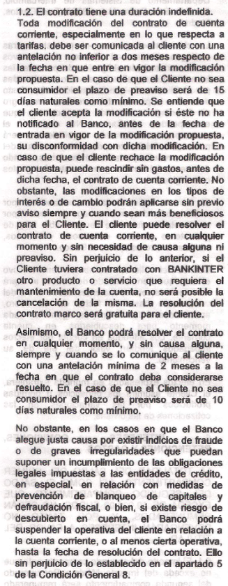 1. El apartado 1 se llama "Objeto y Duración". En su subapartado 1.2 se titula "El contrato tiene una duración indefinida" y dice: Dice que el contrato tiene una DURACIÓN INDEFINIDA pero luego dice que tanto el cliente como el banco pueden resolver el contrato en cualquier momento sin causa alguna. Siempre habla de cuenta corriente, no cita cuenta remunerada.