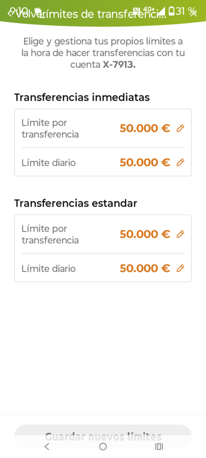No sabía que la app tuviera un apartado "gestionar límites". Es ahí dónde vi ayer que los límites son 10.000 por transferencia y dia para inmediatas, y 30.000 por transferencia y dia para estándar. No sé si fue porque coincidió que cambié de móvil el dia anterior, o por intentar modificar los límites en la app, pero ayer ya no me dejó hacer transferencias inmediatas de más de 1.000 euros. A ver hoy.