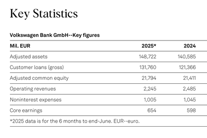 Teniendo en cuenta las sólidas franquicias de VW Bank y su diversificación geográfica en Europa, prevemos una contribución a los beneficios de VWFS Europe relativamente estable y sólida a lo largo de los ciclos del sector automovilístico. Esperamos que el negocio de leasing de VW Bank, especialmente el relacionado con los vehículos eléctricos de batería (BEV), sea el principal motor del crecimiento futuro del negocio. Sin embargo, la posición comercial de VW Bank se ve limitada por su concentración en el sector automovilístico, y sus ingresos, riesgo crediticio y valores residuales seguirán dependiendo en gran medida de la reputación, la solvencia y las ventas de automóviles de VW, que actualmente son mediocres. Además, observamos la reducción del apoyo cíclico del entorno de tipos de interés y las elevadas incertidumbres geopolíticas, que podrían ejercer una presión directa o indirecta sobre las condiciones económicas, en particular debido a la intensificación de las tensiones comerciales y las incertidumbres políticas.