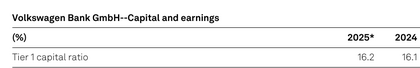 El coeficiente Tier-1 (CET 1) a mediados de 2025 estará muy por encima de los requisitos mínimos reglamentarios de capital total. Además, la calidad del capital total ajustado de VW Bank es muy alta, en ausencia de capital híbrido Tier-1.