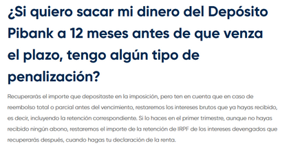 1.- Pibank se salta a la torera el derecho de DESISTIMIENTO por sistema. Nunca DESISTE un depósito y obliga al cliente a que él mismo CANCELE o como mucho lo CANCELAN ellos.
