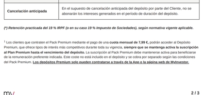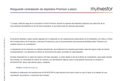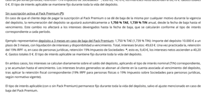 En caso de que el cliente deje de pagar la suscripción al Pack Premium o se dé de baja de la misma por cualquier motivo durante la vigencia del depósito, la remuneración del depósito se ajustará automáticamente a 1,750 % TAE, 1,739 % TIN anual, desde la fecha de baja hasta el vencimiento. Este cambio no afectará a los intereses devengados hasta la fecha de baja, que se calcularán conforme al tipo de interés