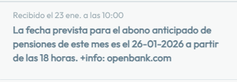 #11494 Re: Cobro imv Openbank - Ingreso mínimo vital Ver mensaje de Winkland24 Saturn Seguir 23/01/26 10:08 Chicos/as, me ha llegado la notificación del cobro desde OpenBank...!!!!¿Se supone entonces que no me han aceptado aún el cambio al BBVA?Que alguien me ayude si sabe o supone algo, por favor.¡Abrazos y ALEGRÍA! 1 Responder