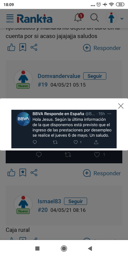#122 Re: Paro mayo 2021 Sergio8900 Seguir 05/05/21 01:52 Bbva me parece k día 6 Alguien a cobrado? Responder