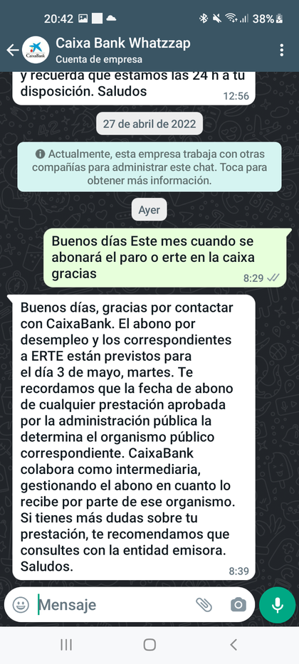 #25 Re: Cobro paro CaixaBank Ver mensaje de Solytary Adter Seguir 02/05/22 21:42 Noa dice eso, pero si hablas con un operador te dicen que el dia 4 Responder