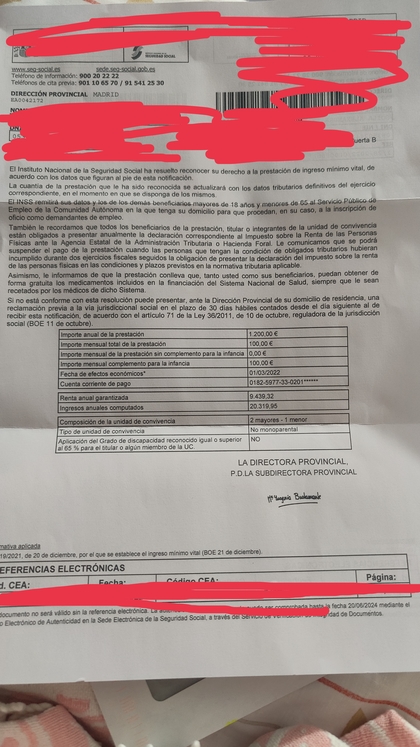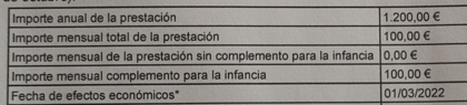 #17 Re: IMV y la Declaración de la Renta - Ingreso mínimo vital Ver mensaje de Soila Alexandra Top 100 ritekg5 Seguir 26/06/22 10:06 Solo te han concedido el complemento a la infancia en forma de 100 euros al mes por el menor que incluye tu unidad familiar... la tabla de la hoja que te han enviado lo dice bien claro ¿qué es lo que no entiendes? Responder