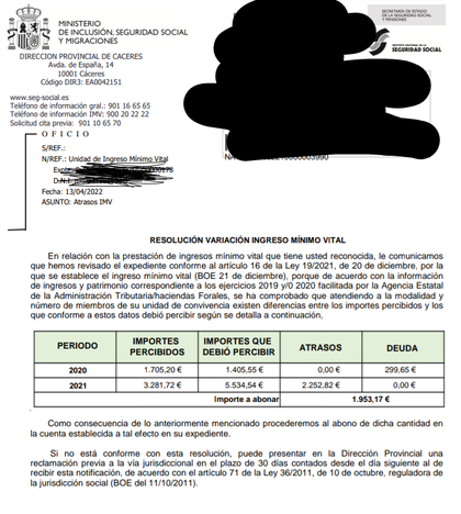 De la misma forma, si en dicha "actualización" de finales de año el IMV te baja porque en la declaración de la renta tuviste otros ingresos, llámalo desempleo, subsidios, ayudas, etc, pues ese dinero es descontado del IMV anual que te corresponde y, por tanto, el importe mensual te baja y tiene efectos desde primeros de ese año... la diferencia entre lo que te pago la Seguridad Social cada mes menos lo que debería haberte pagado lo denominamos DEUDAS, las cuales serán reclamadas en su momento más adelante por la Seguridad Social como cobros indebidos del IMV, haciéndote una liquidación e indicándote "pues nos tienes que devolver XX euros que te pagamos de más el año pasado", aunque a algunas personas les han compensado ATRASOS de otros años con DEUDAS del anterior, liquidándose solo la diferencia (te paso una foto de ejemplo para que lo entiendas mejor)