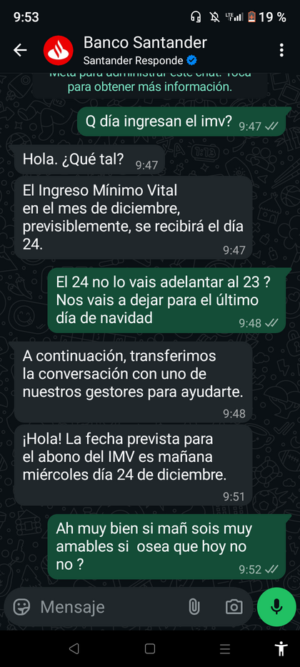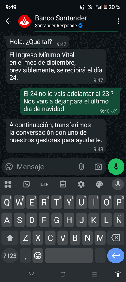 Nada que hasta man según el WhatsApp del banco Santander 0 🥺 😔